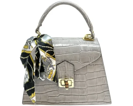 The classic trapezoid design is accentuated by clean lines and an elegant gold clasp, adding both security and a touch of luxury. A luxurious scarf with unique patterns adorns the bag, bringing a dynamic and lively flair to its sophisticated look. Available in a range of stunning colors, including classic black, elegant grey, and light cyan, the Vittoria handbag is designed to match your style.